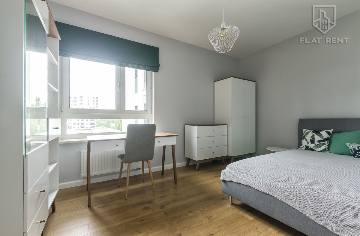 Lokal jest usytuowany na 4 piętrze, w budynku oddanym do użytkowania w 2020 r. Na jego powierzchnię 68 m2 składa się: salon z aneksem kuchennym wyposażonym w sprzęt AGD i wyjściem na balkon, sypialnia z dwoma dużymi szafami, pokój gościnny, łazienka z kabiną prysznicową, pralnia z suszarką i pralką oraz hol z szafą w zabudowie. Do mieszkania przynależy podwójne miejsce postojowe w garażu podziemnym.